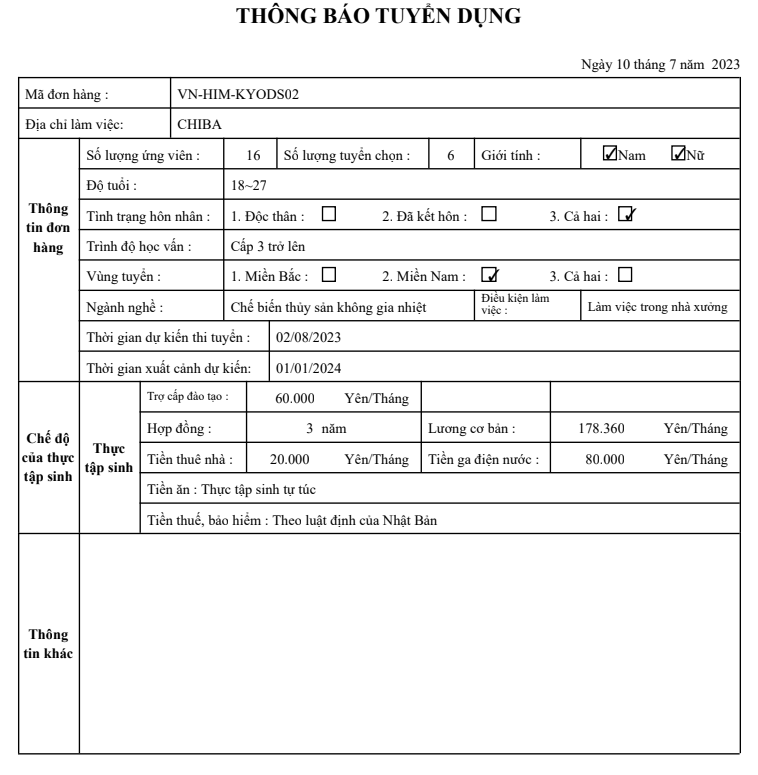 Chào tháng 8 yêu thương với đơn hàng cực tốt cho cả lao động Nam và Nữ! Đó là đơn chế biến thuỷ sản không gia nhiệt tại Chiba - Nhật Bản. Với mức lương cao 17.8 man/tháng cùng nhiều phúc lợi hấp dẫn. Cùng JVNET Việt Nam tìm hiểu chi tiết qua thông báo tuyển dụng dưới đây nhé!
