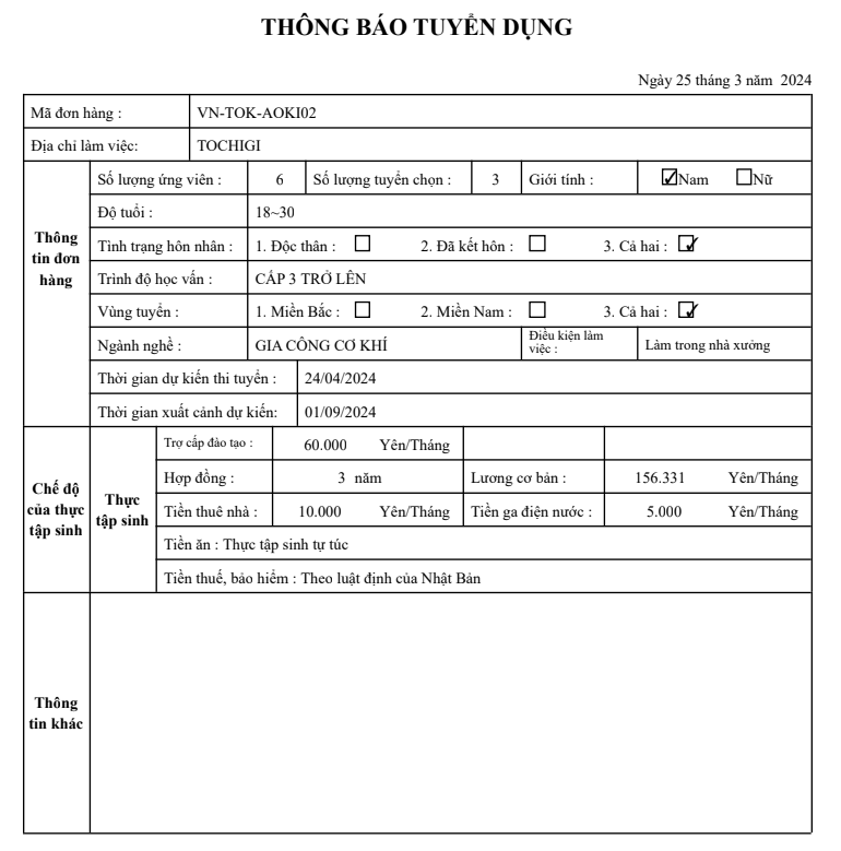 Thu nhập ổn định, tiền nhà THẤP, không yêu cầu kinh nghiệm, chế độ tốt: Đó là những ưu điểm nổi bật của đơn hàng gia công cơ khí tại Tochigi. Nếu bạn có mong muốn đi Nhật và yêu thích ngành cơ khí thì đừng bỏ qua đơn hàng này nhé! Lưu ý, đơn hàng này chỉ tuyển 6 ứng viên đăng ký sớm nhất thôi.