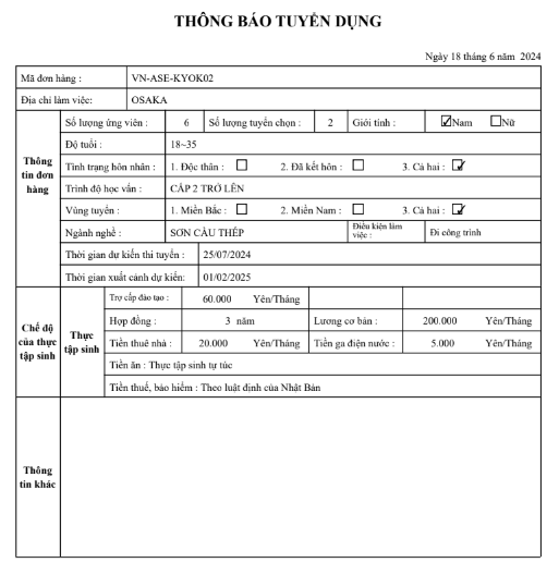 ĐƠN MỚI VỀ: Sơn cầu thép - Lương 20 man/tháng (chưa tính tăng ca, làm thêm). Nơi làm việc tại tỉnh Osaka xinh đẹp của Nhật Bản. Nếu bạn yêu thích công việc này thì hãy đăng ký ngay hôm nay để kịp phỏng vấn vào tuần tới nhé! JVNET VN luôn sẵn sàng hỗ trợ bạn giải đáp mọi thắc mắc 24/7.